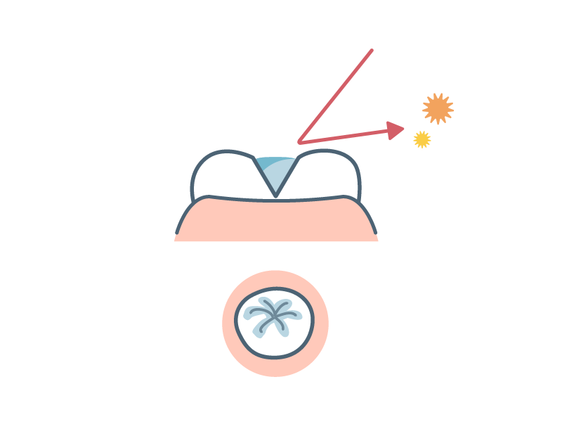 そこで、溝の中に虫歯菌が入り込まないよう、溝の部分をプラスチック製の樹脂(シーラント)でふさいで虫歯の予防を行います。